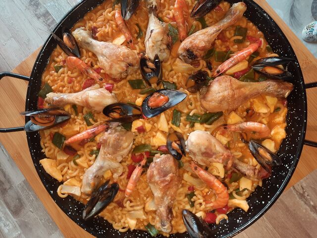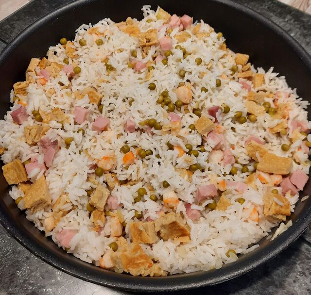 18€ La cantonés: Œufs, sauce soja, huile de sésame, oignons, gingembre, jambon, crevette, petit pois.