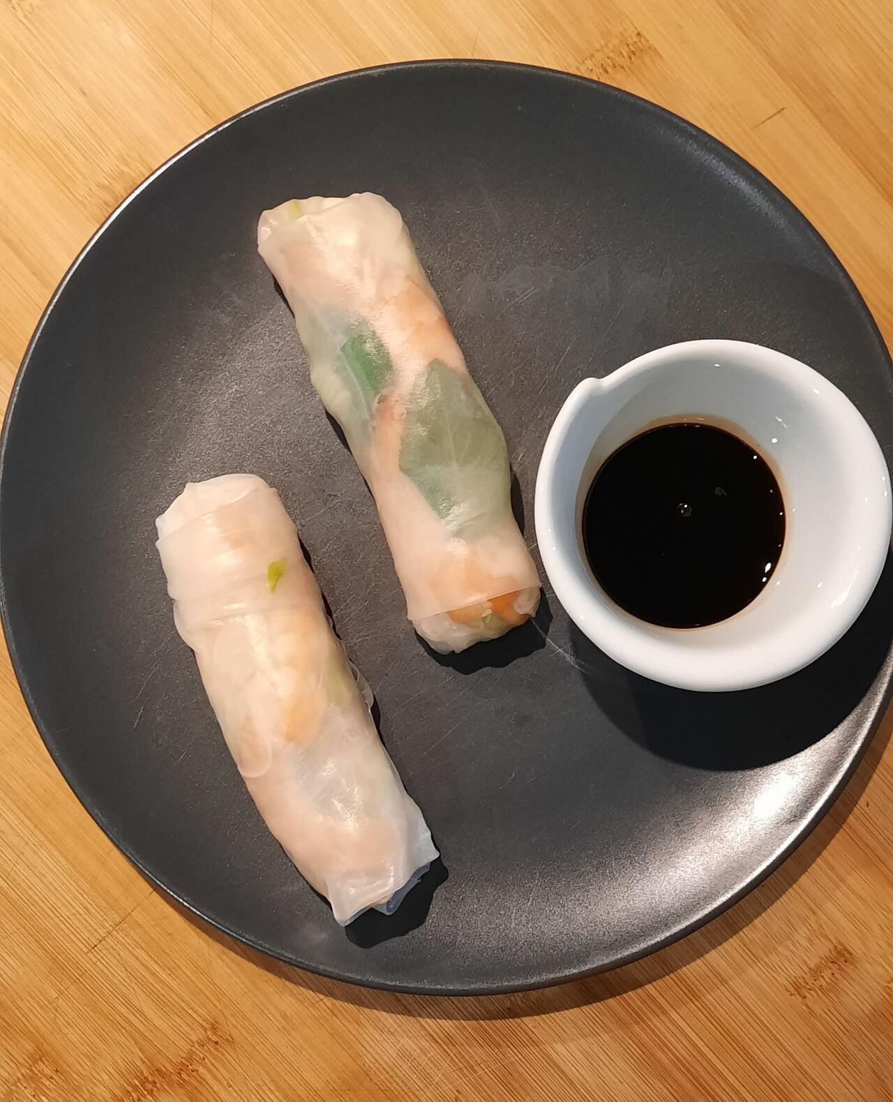 Chou, carottes, concombre, pousses de soja, cacahuètes, accompagnée d’une vinaigrette à l’huile de sésame.