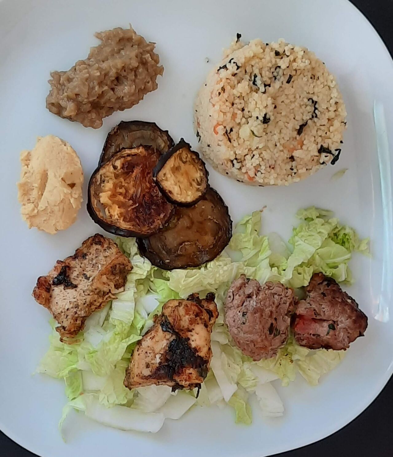 Taboulé libanais, houmous, caviar d’aubergine, kefta, poulet mariné et pita.
