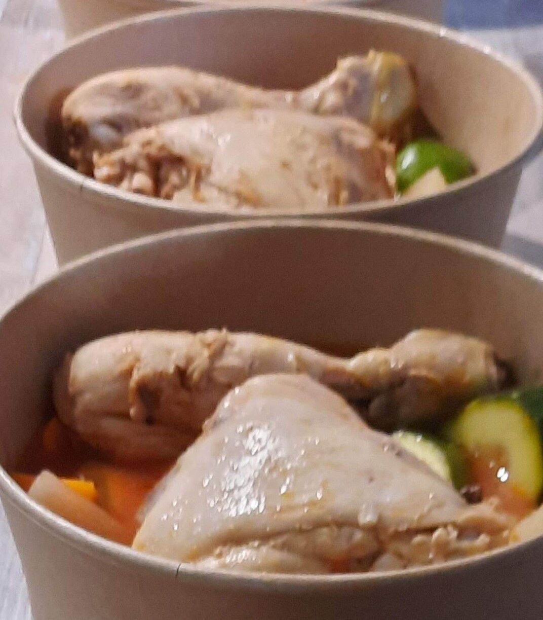 Un poulet au citron, gingembre, riz blanc et sa sauce à base de soja et citron.